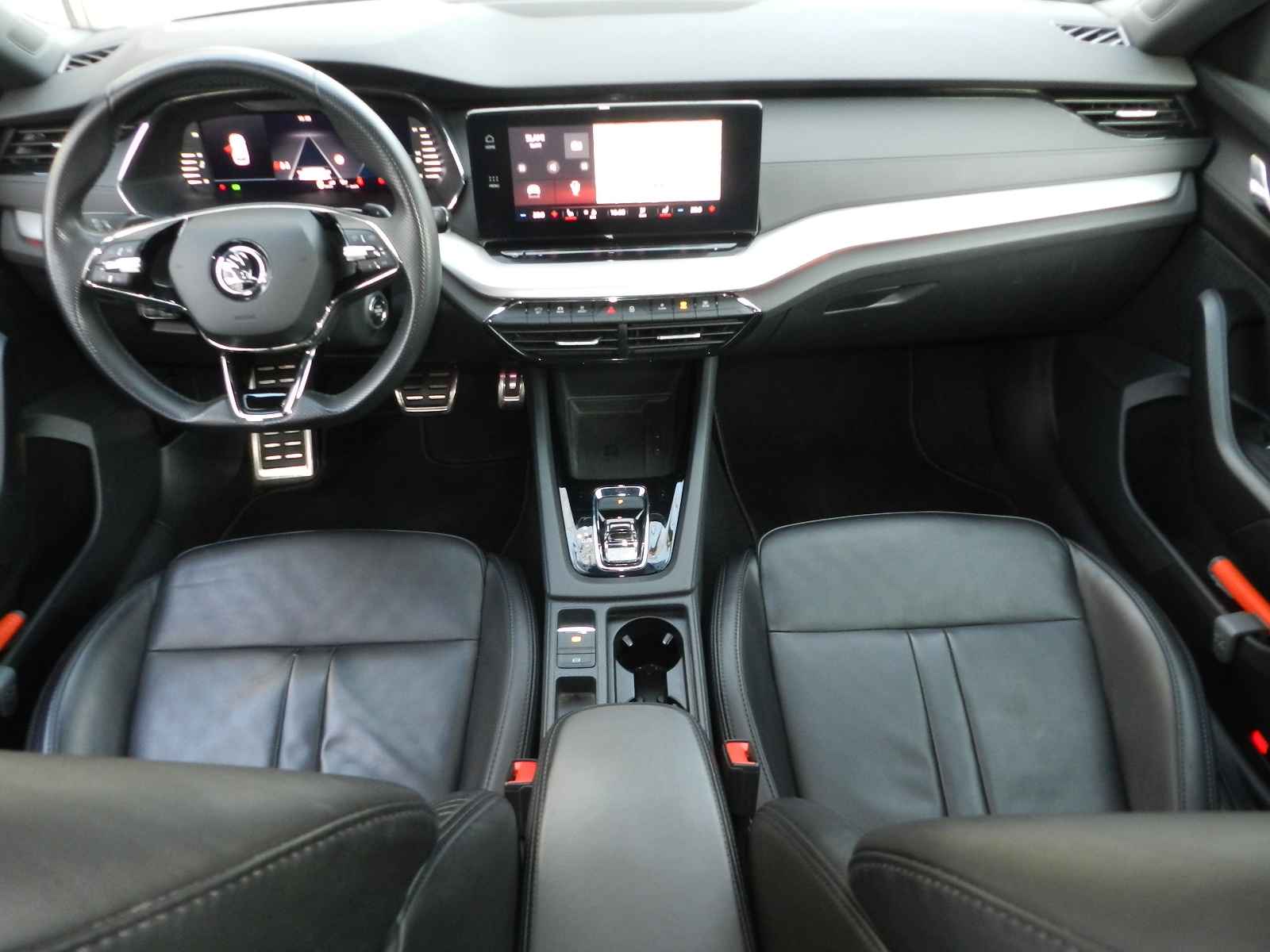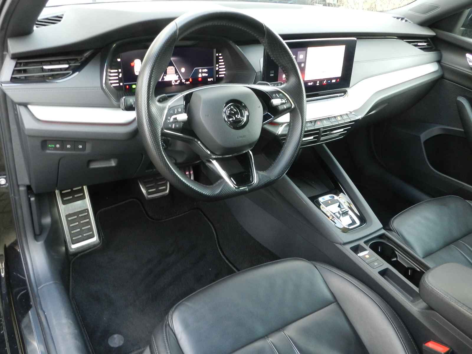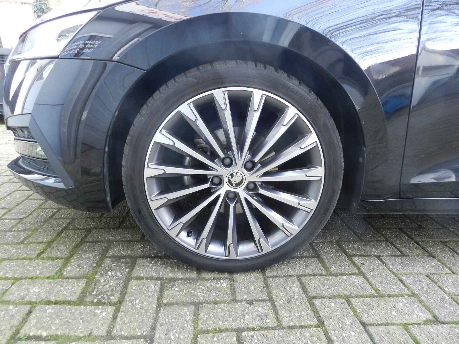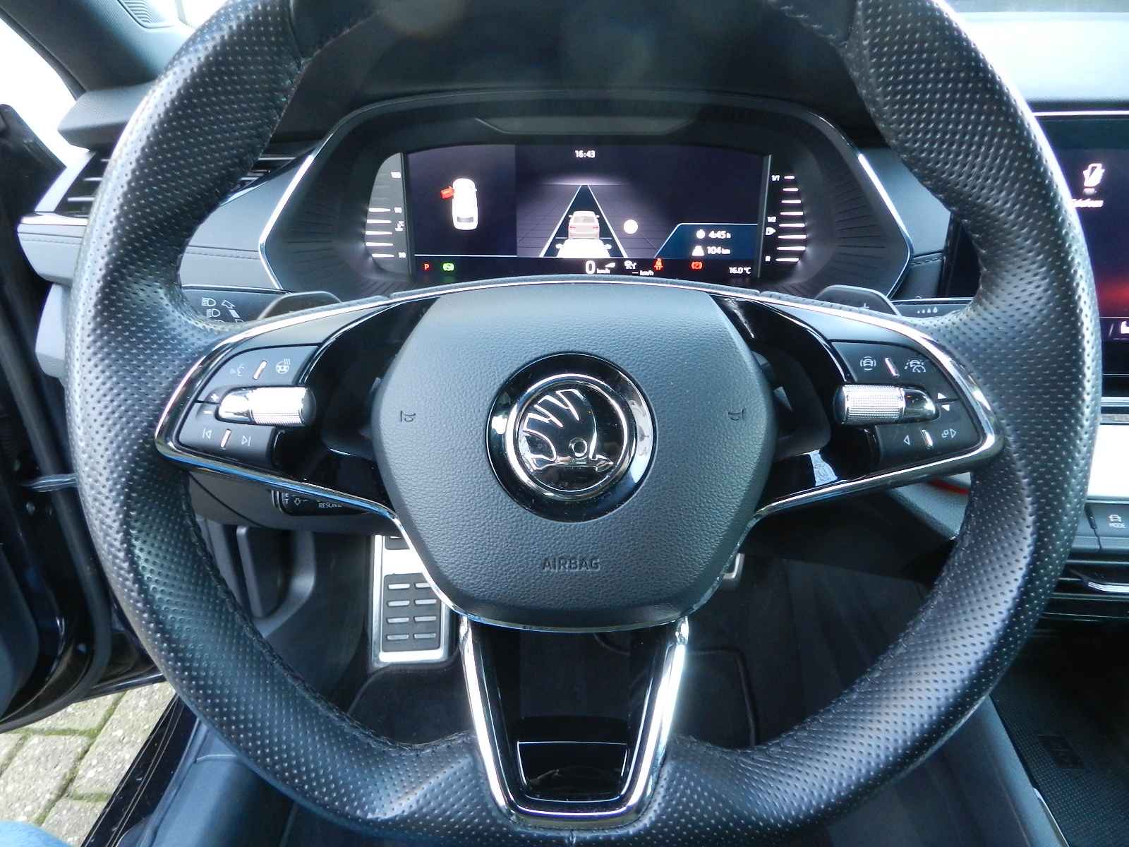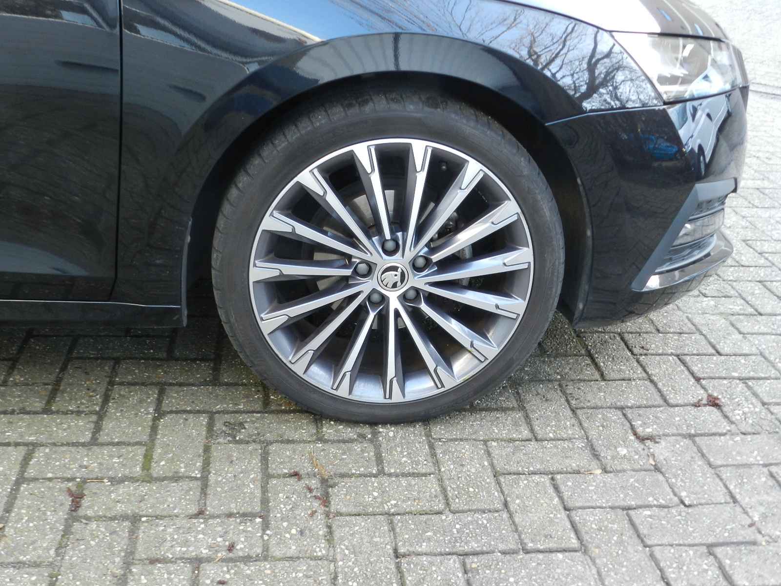 De auto is voorzien van o a, sportieve lederen bekleding met stoel en stuur verwarming, Zwarte hemelbekleding en een origineel Skoda Sport pakket, 19"Lichtmetalen velgen.