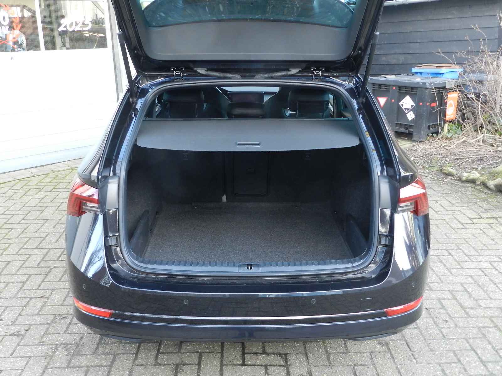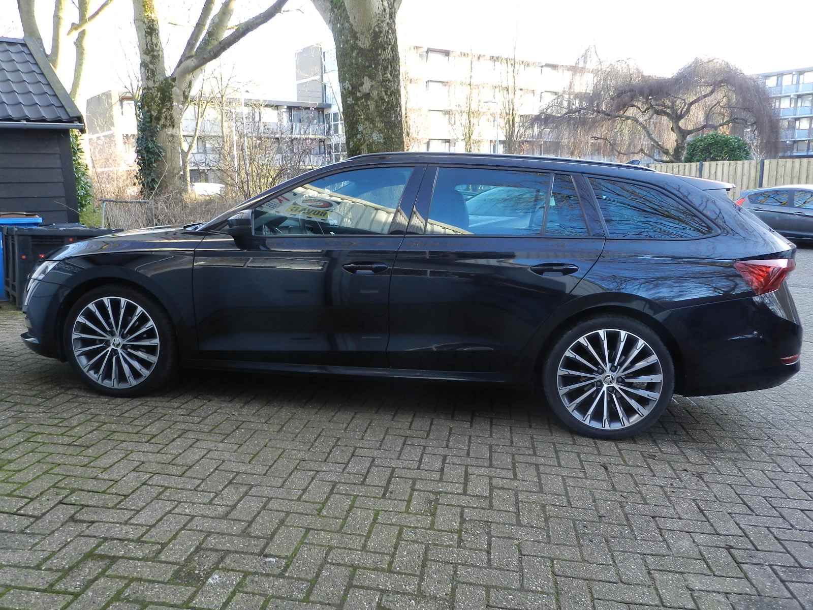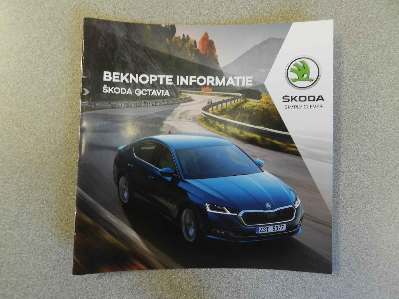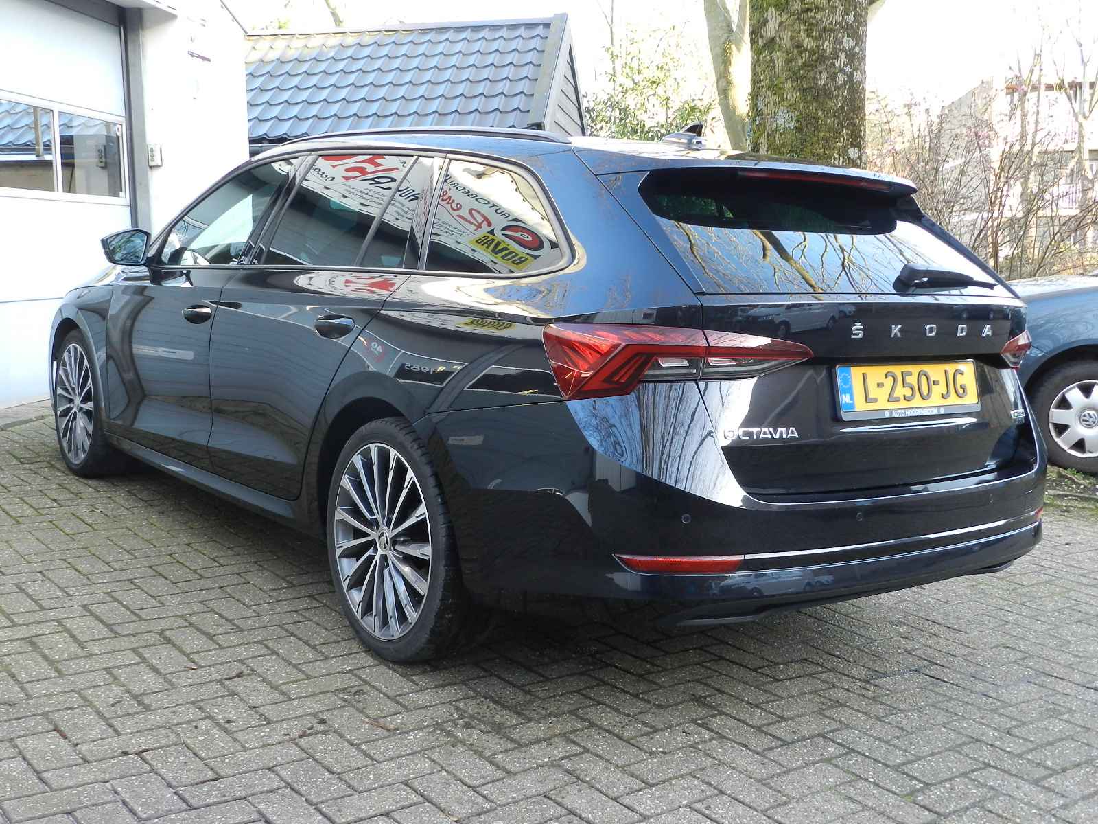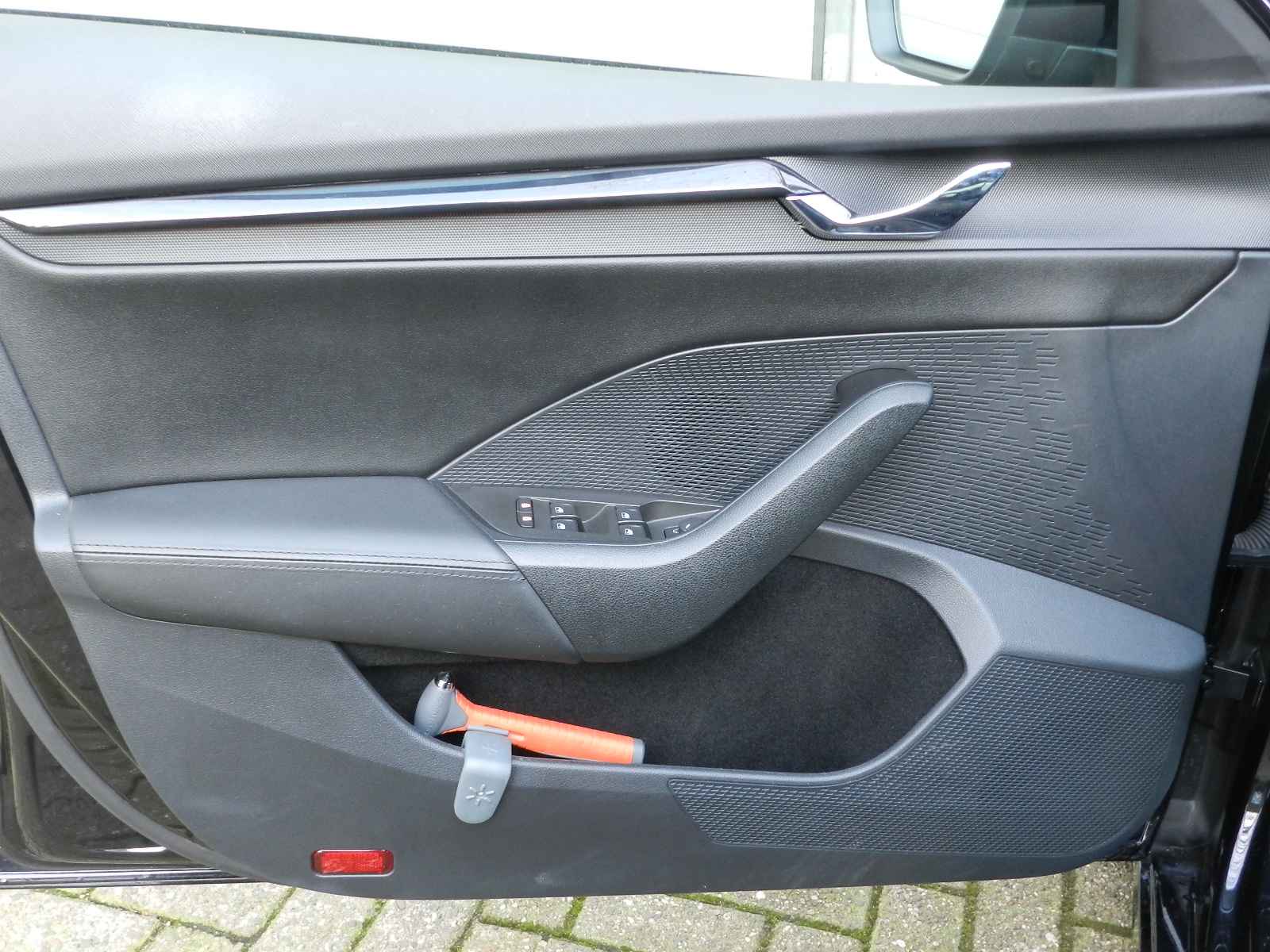 De auto is voorzien van o a, sportieve lederen bekleding met stoel en stuur verwarming, Zwarte hemelbekleding en een origineel Skoda Sport pakket, 19"Lichtmetalen velgen.